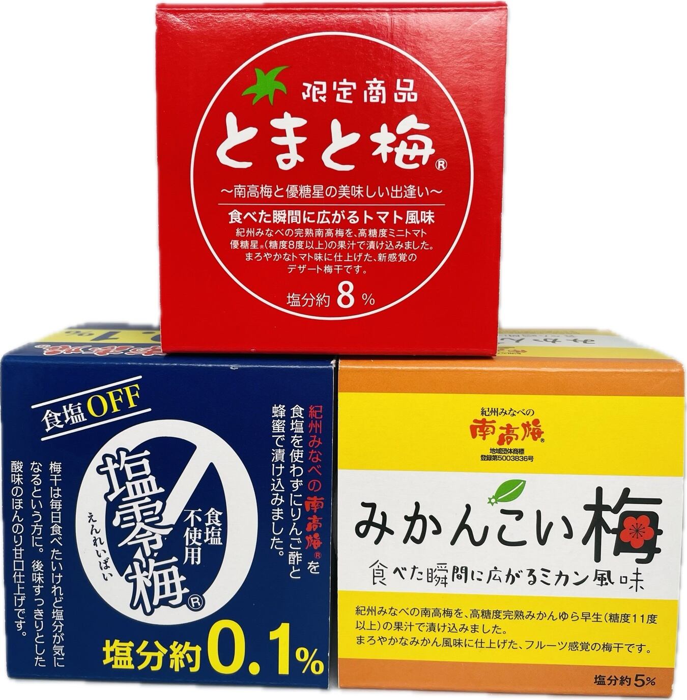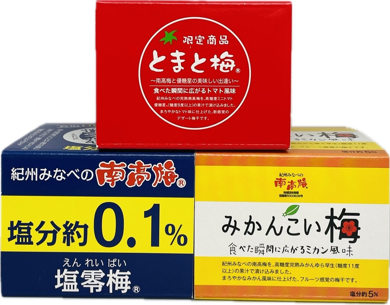 一番人気のとまと梅、みかんこい梅、塩零梅の3つの個性的な梅干しを取り揃えました。健康に気を使う方、梅干しファンの方にぜひお試しいただきたい逸品です。