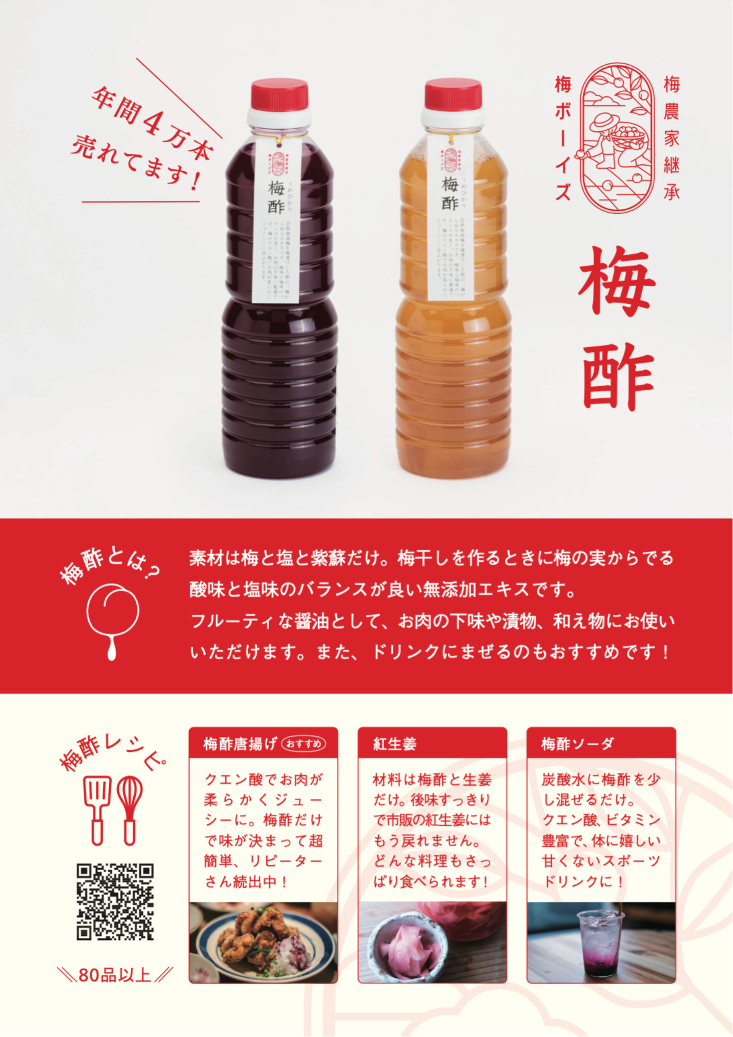 ふっくらとした果肉と、しっかりとした酸味が特長で、ご飯やおにぎり、お茶漬けとの相性も抜群。保存料・調味料・甘味料などは一切使用しておらず、自然の力だけで仕上げています。