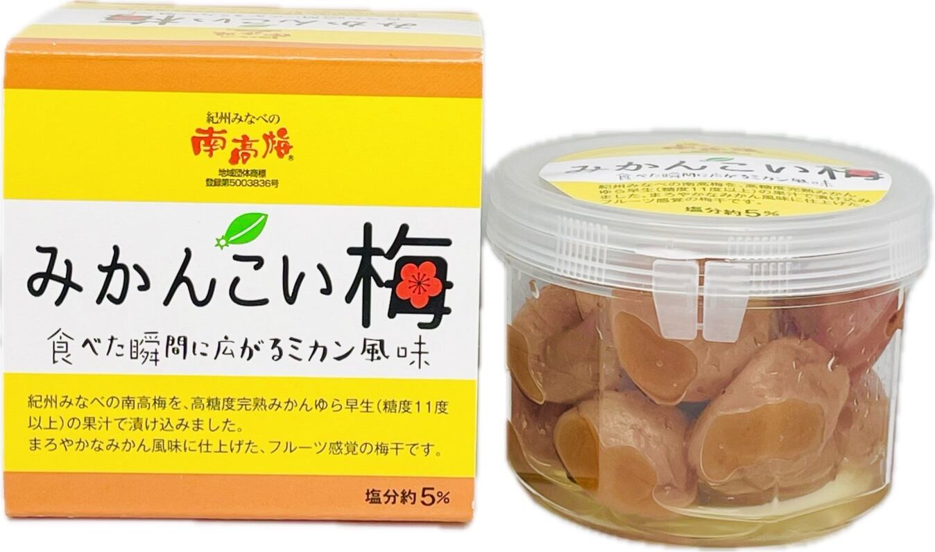紀州みなべ南高梅の中でも特に人気の「みかんこい梅」。南高梅を、高糖度完熟みかんの果汁で漬け込んだ、食べた瞬間に広がるほんのりみかん風味が特徴です。