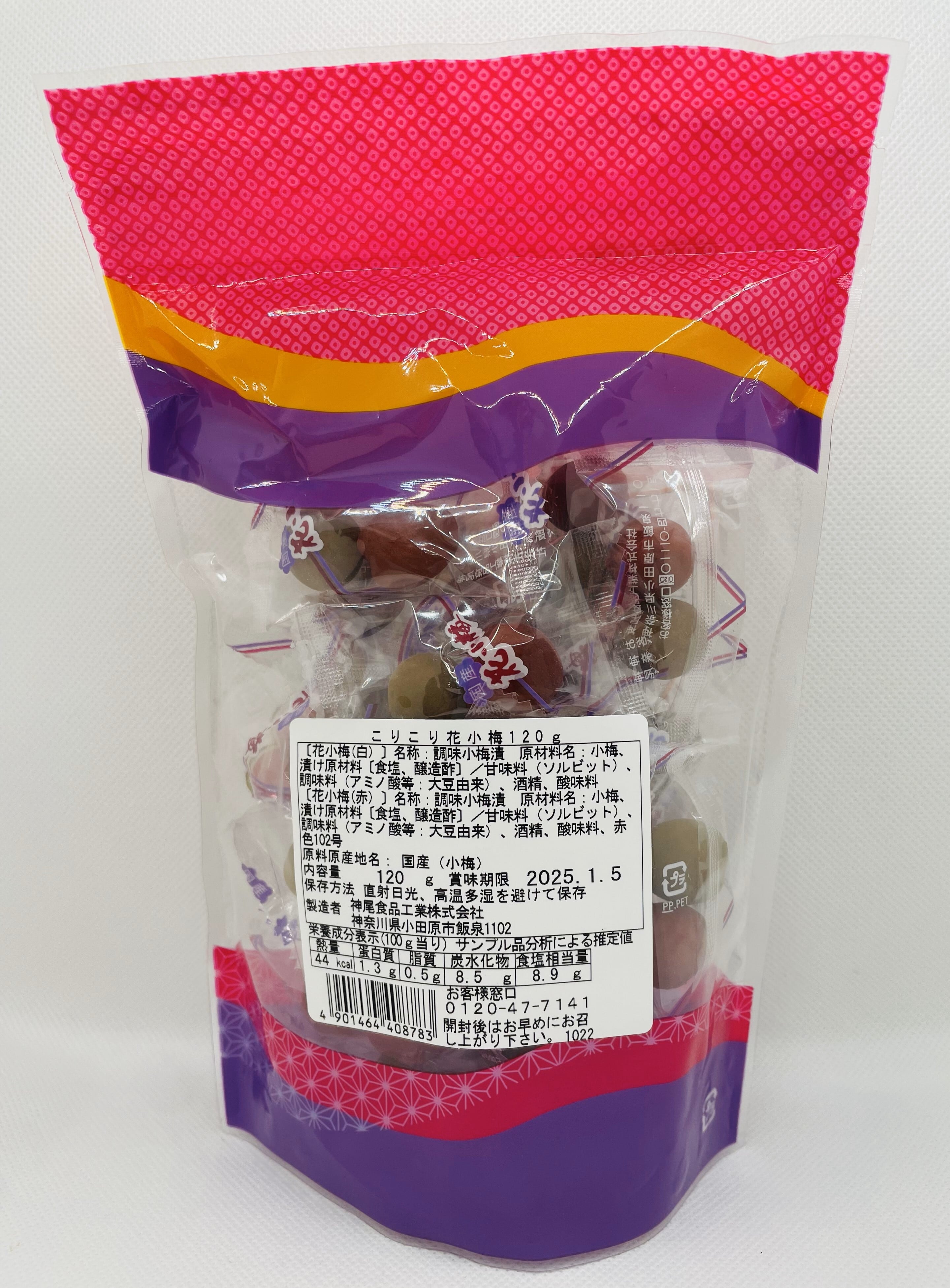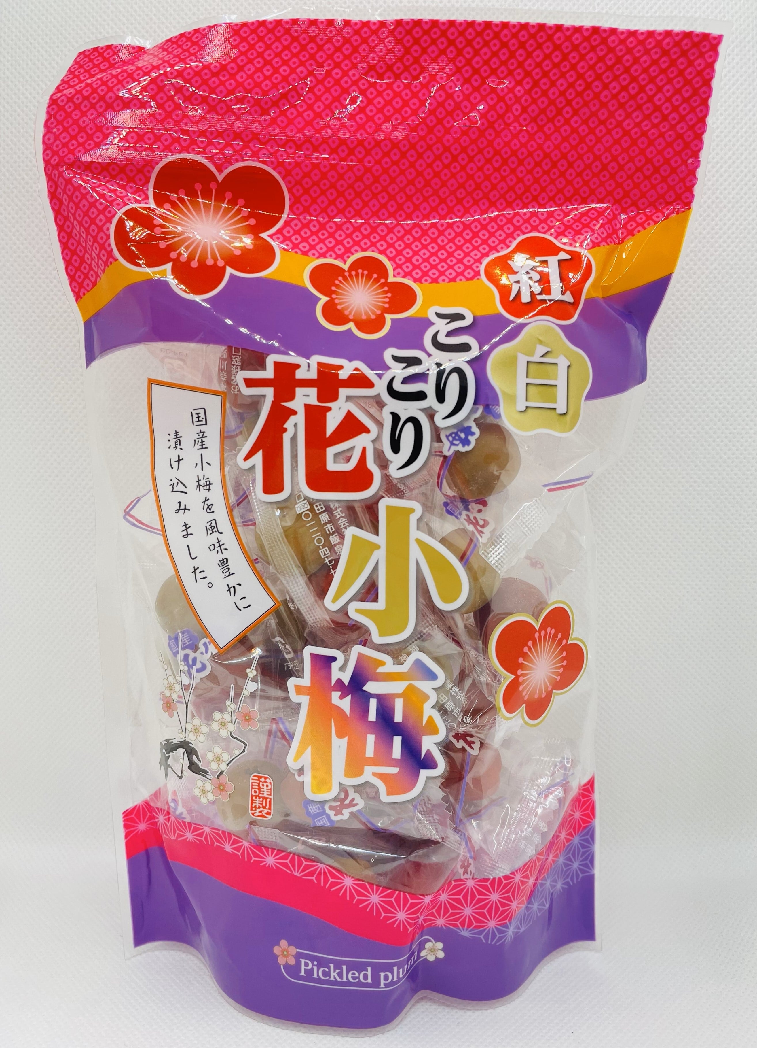 国産の小梅漬けを贅沢に纏った「紅白こりこり花小梅」を、一粒ずつ丁寧に包装しました。